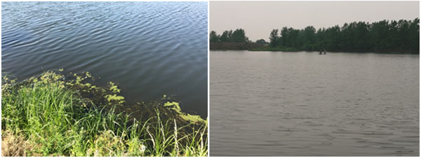 污水塘主要污染為醫(yī)藥化學(xué)污染,水體發(fā)黑,完全沒有透明度,惡臭熏人,長約238米,寬約182米,面積約3.3萬平方米,平均水深未知,據(jù)介紹為1米左右,底泥較厚;污水通過西南角污水渠流入水體,污水渠中水色發(fā)黑,透明度約15cm;在南側(cè)偏東位置有一出水閘門,有水流出直接進(jìn)入河道;北側(cè)偏東位置,有一入水閘門,暫關(guān)停。