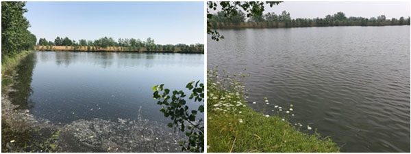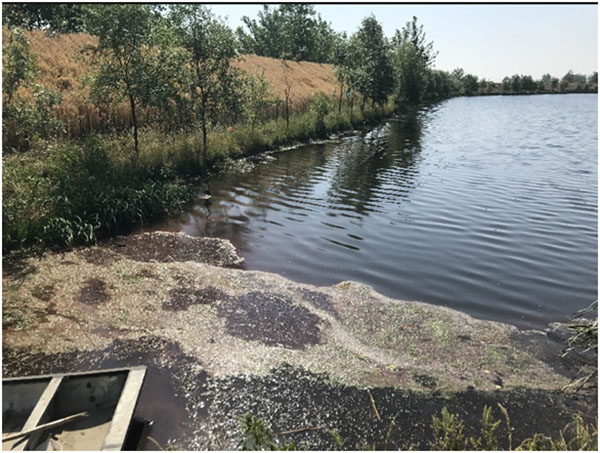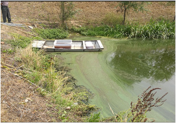 污水塘主要污染為醫(yī)藥化學(xué)污染,水體發(fā)黑,完全沒有透明度,惡臭熏人,長約238米,寬約182米,面積約3.3萬平方米,平均水深未知,據(jù)介紹為1米左右,底泥較厚;污水通過西南角污水渠流入水體,污水渠中水色發(fā)黑,透明度約15cm;在南側(cè)偏東位置有一出水閘門,有水流出直接進(jìn)入河道;北側(cè)偏東位置,有一入水閘門,暫關(guān)停。