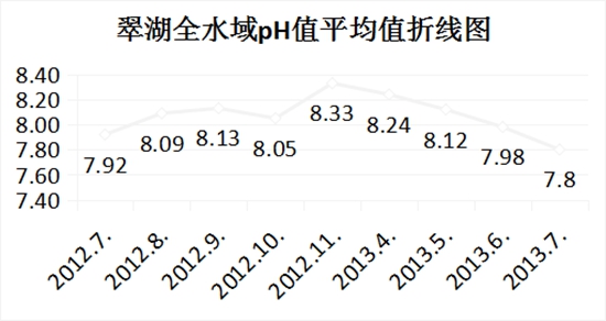翠湖水域2013年7月26日葉綠素a均值為:18.99mg/m3,?2012年7月23日葉綠素a均值為55.64mg/m3;