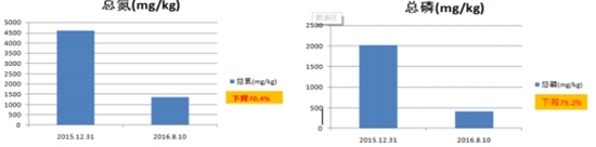 治理一年后,內(nèi)源污染大幅降低,底泥顏色由黑變灰,再變?yōu)橥咙S色,其中2015年12月31號(hào)---2016年8月10日8個(gè)月時(shí)間,底泥中總氮下降70.4%,總磷下降79.2%。