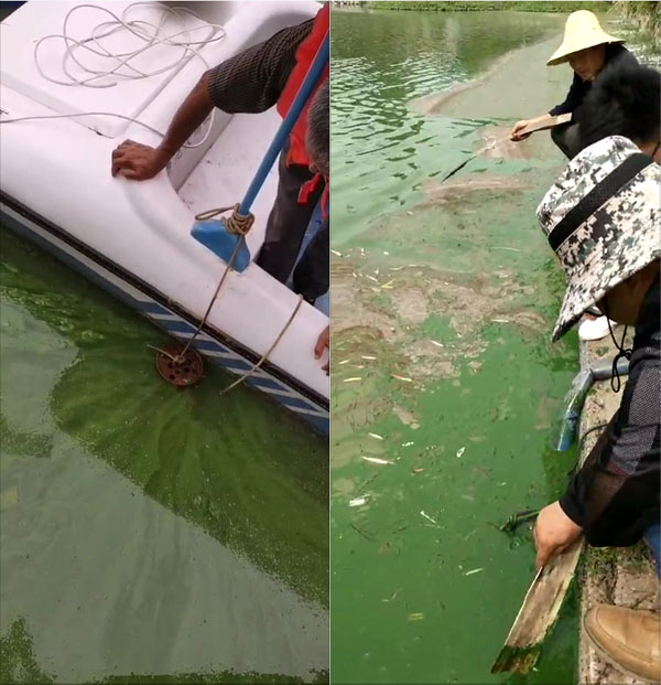 因段大院水塘水體封閉,死亡藍(lán)藻長(zhǎng)時(shí)間積聚在水塘的下風(fēng)口,并自然腐敗分解,再次釋放出污染物質(zhì)進(jìn)入水體,因此自7月18日起連續(xù)10多天抽排死亡藍(lán)藻水華,減少水體污染源,從而加速效果。(僅抽排死亡后飄浮在水面上的藍(lán)藻水華,并非抽排段大院水體)。